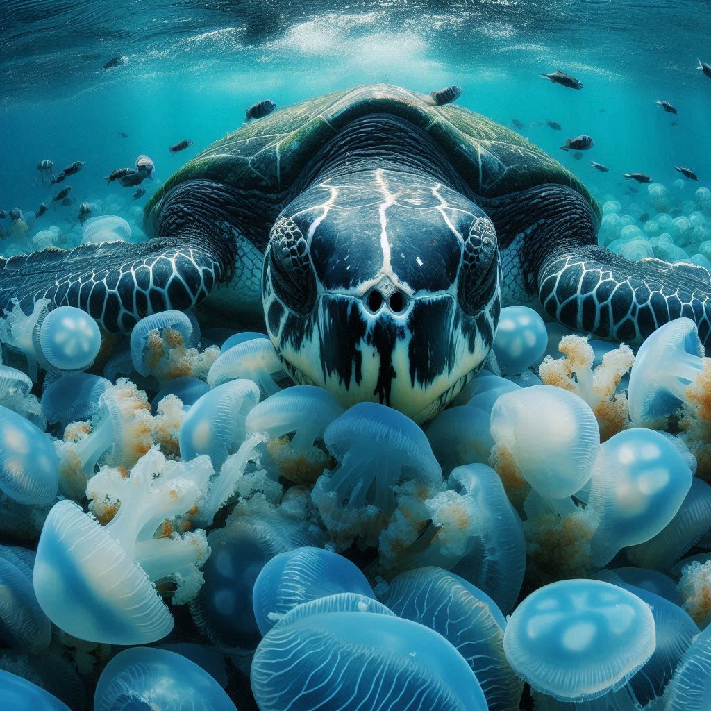 장수거북은 해파리를 주요 식량으로 삼습니다. 그들은 해파리를 먹기 위해 수천 킬로미터를 이동하며, 이는 해파리 개체 수 조절에 중요한 역할을 합니다. 장수거북은 또한 말미잘과 연체동물도 먹습니다.