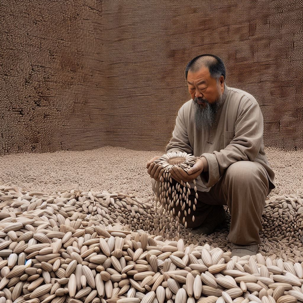 중국 출신의 예술가 아이 웨이웨이는 "Sunflower Seeds"라는 작품을 통해 대규모 환경 문제를 시각적으로 표현했습니다. 이 작품은 수백만 개의 손으로 만든 도자기 해바라기 씨앗으로 이루어져 있으며, 환경 파괴와 자원 낭비를 비판합니다.
