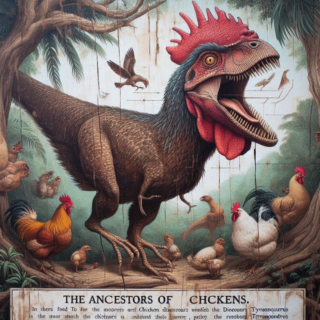 닭은 육식 공룡인 티라노사우루스 렉스와 같은 공룡들로부터 진화한 것으로 알려져 있습니다. 현대 조류들은 공룡의 후손으로 간주되며, 화석 기록과 유전자 분석을 통해 입증되었습니다. 닭의 직접적인 조상은 야생의 적갈색 정글고기 (Red Junglefowl, 학명: Gallus gallus)로 알려져 있습니다. 주로 동남아시아에 서식하는 작은 닭 종으로, 현대의 가금류들과 매우 밀접한 관련이 있습니다. 닭은 오랜 역사를 거쳐 인류와 밀접하게 협력해 온 가축 중 하나로, 다양한 문화적 의미와 식량 자원으로 중요한 역할을 하고 있습니다.
