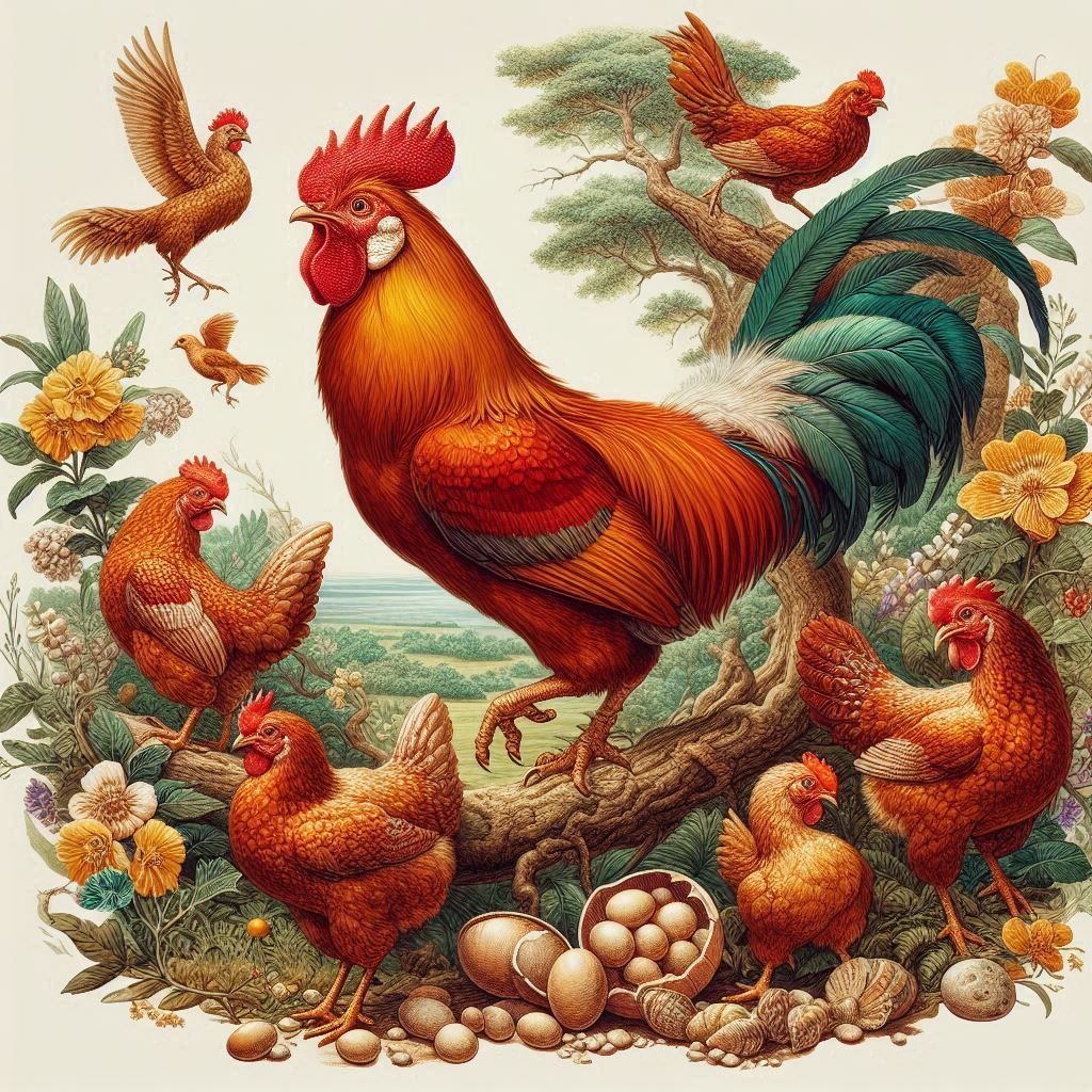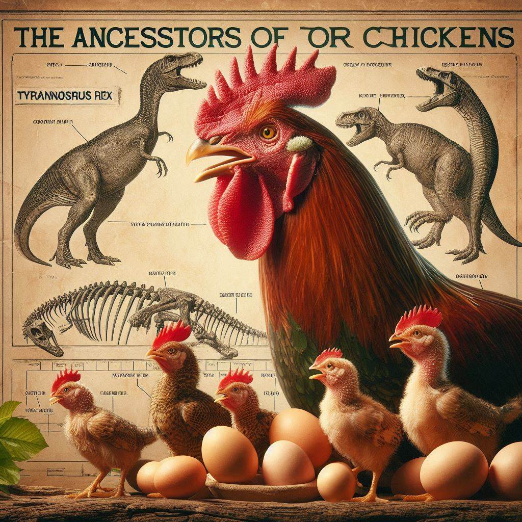 닭은 육식 공룡인 티라노사우루스 렉스와 같은 공룡들로부터 진화한 것으로 알려져 있습니다. 현대 조류들은 공룡의 후손으로 간주되며, 화석 기록과 유전자 분석을 통해 입증되었습니다. 닭의 직접적인 조상은 야생의 적갈색 정글고기 (Red Junglefowl, 학명: Gallus gallus)로 알려져 있습니다. 주로 동남아시아에 서식하는 작은 닭 종으로, 현대의 가금류들과 매우 밀접한 관련이 있습니다. 닭은 오랜 역사를 거쳐 인류와 밀접하게 협력해 온 가축 중 하나로, 다양한 문화적 의미와 식량 자원으로 중요한 역할을 하고 있습니다.