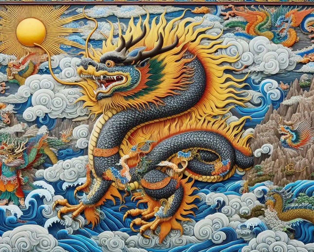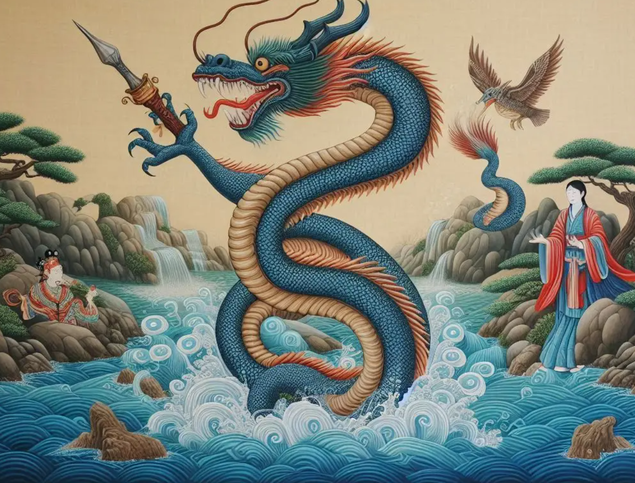 중국 신화에서 가장 유명한 용 중 하나는 용왕(龍王)입니다. 사해(四海)를 각각 관할하는 네 명의 용왕은 바다의 조절자이자 인간의 기우(祈雨)를 들어주는 존재입니다. 또 하나의 상징적 인물은 황제 헌원(軒轅)입니다. 그는 전설 속에서 용을 타고 하늘로 올라간 인물로 묘사되며, 이는 곧 인간의 신성화와 관련됩니다.
