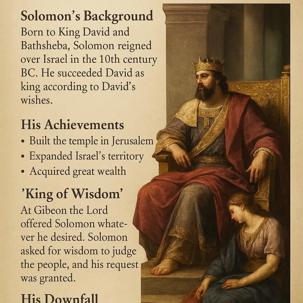 그는 다윗의 아들이자, 하나님께 직접 선택받은 통치자였으며, 동시에 인간적인 욕망과 교만으로 인해 몰락한 인물이기도 했습니다.