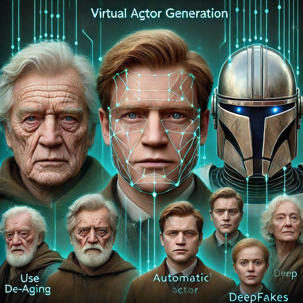 - 딥페이크: 캐릭터의 얼굴을 다른 배우나 캐릭터로 대체하는 데 사용됩니다. 예: 스타워즈: 만달로리안에서 고인이 된 배우 피터 쿠싱의 모습을 AI로 재현.